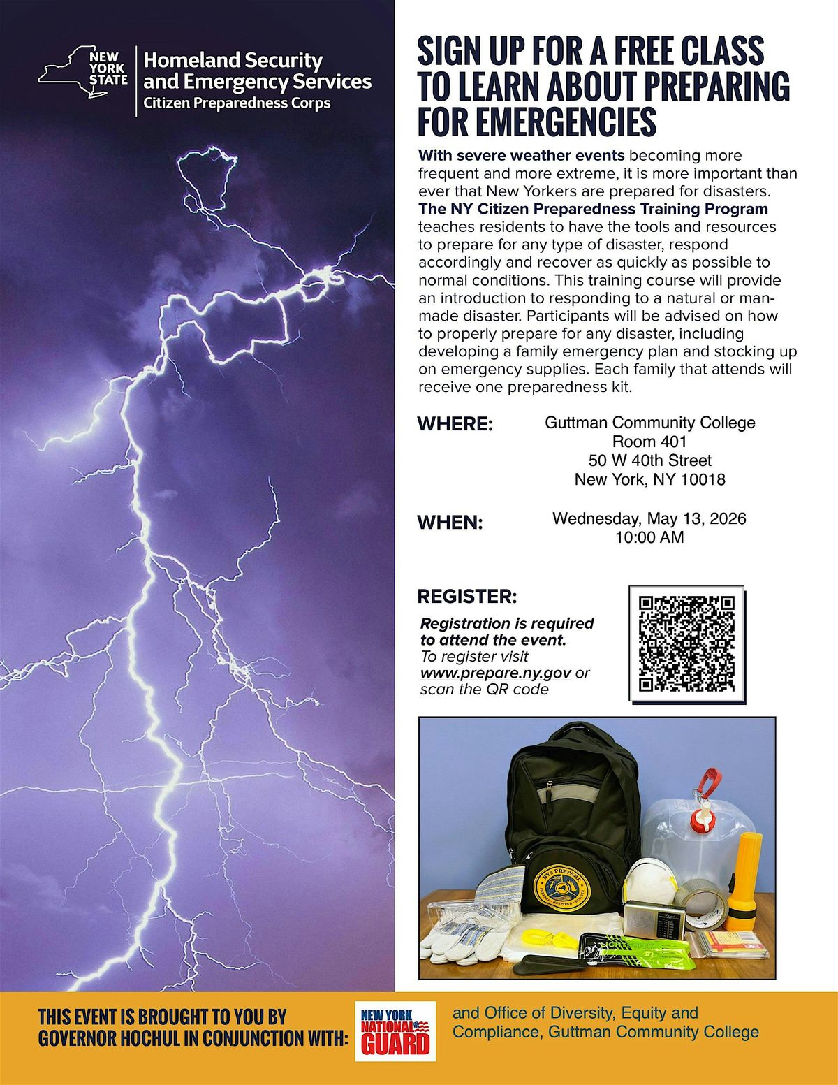 We’re excited to share an upcoming opportunity to help us all be more informed, prepared, and resilient! The Office of Diversity, Equity & Compliance (ODEC) at Guttman CC, in partnership with the New York State Division of Homeland Security and Emergency Services, is hosting a Citizen Preparedness Training on Wednesday, May 13 at 10:00 AM in Room 401. This interactive training will provide practical guidance on how to prepare for emergencies and respond effectively to both natural and manmade disasters. Participants will learn how to develop a family emergency plan, build a basic emergency supply kit, and understand the steps they can take to stay safe during unexpected situations. As an added bonus, each participant will receive a preparedness kit, and light refreshments will be provided. We hope you will join us for this important and empowering session.