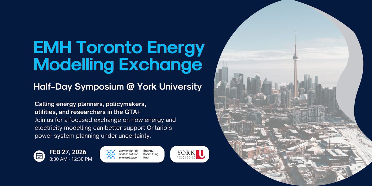 The EMH Toronto Energy Modelling Exchange is a half-day, in-person symposium taking place on February 27, 2026, from 8:30 to 12:30, followed by a networking lunch, at the Schulich Executive Learning Centre, York University. The event focuses on assessing energy and electricity modelling capacities and needs in Ontario in an environment of growing uncertainty.