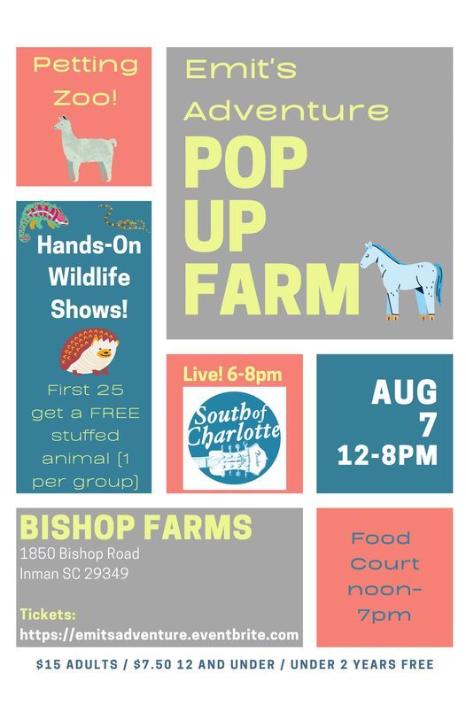 Ready for some hands-on excitement for the whole family? Head over to Bishop Farms in Inman from noon-8pm on Saturday August 7th for Emit's Adventure Pop Up Farm!