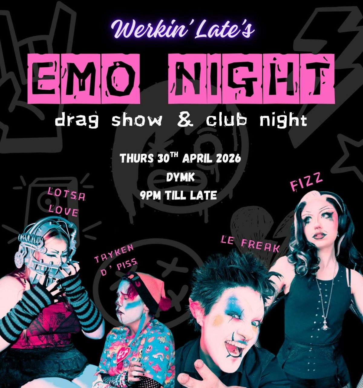 Get ready to fall back into 2014 for Bournemouth’s queerest emo night of your wildest tumblr dreams. Nostalgic music and references all night, started off with an emo drag show, featuring local drag artists FIZZ, Le Freak, Tayken D’Piss and Lotsa Love. Followed by a club night full of iconic emo and pop punk tunes all night long.