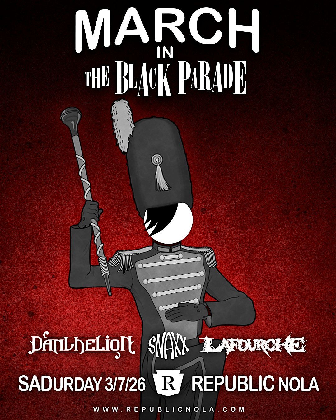 Emo Night is MARCHING into the spring with a shower of tears from Dan The Lion, Lafourche, and Snaxx as your drum majors. A symphony of sadness is ready to take to the parade route, but will you be in that number?