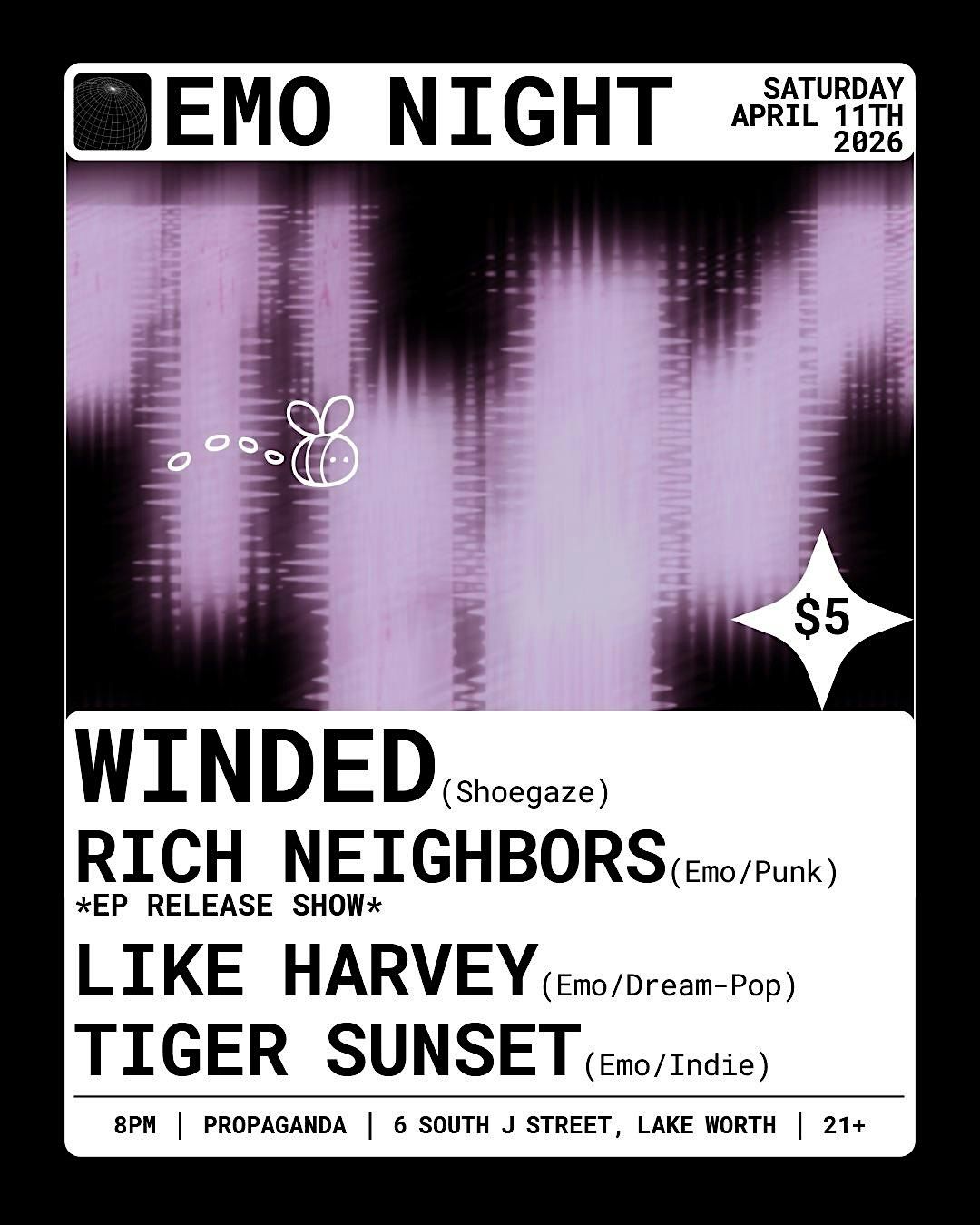 Emo Night feat all original music: Winded (shoegaze) Rich Neighbors (midwest emo/punk) Like Harvery (emo/indie) Tiger Sunset (emo/indie)