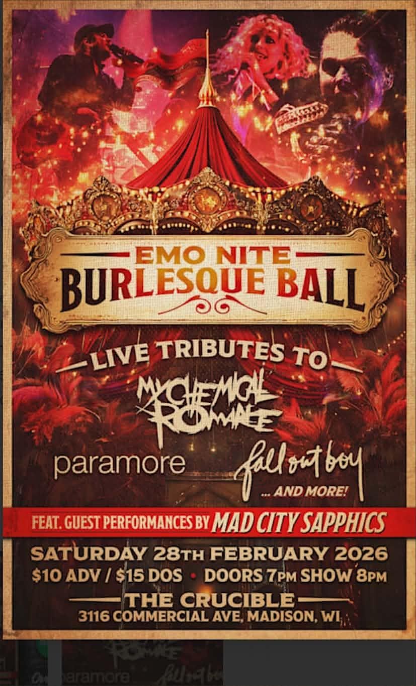 Get ready for Emo Nite LIVE!, the ultimate live emo show by Star 67 featuring the Midwest's only My Chemical Romance tribute band! Join us at the Crucible in Madison, WI for an unforgettable night of emo anthems and nostalgic vibes. And this special one-night-only Burlesque Ball edition will feature performances from Mad City Sapphics!