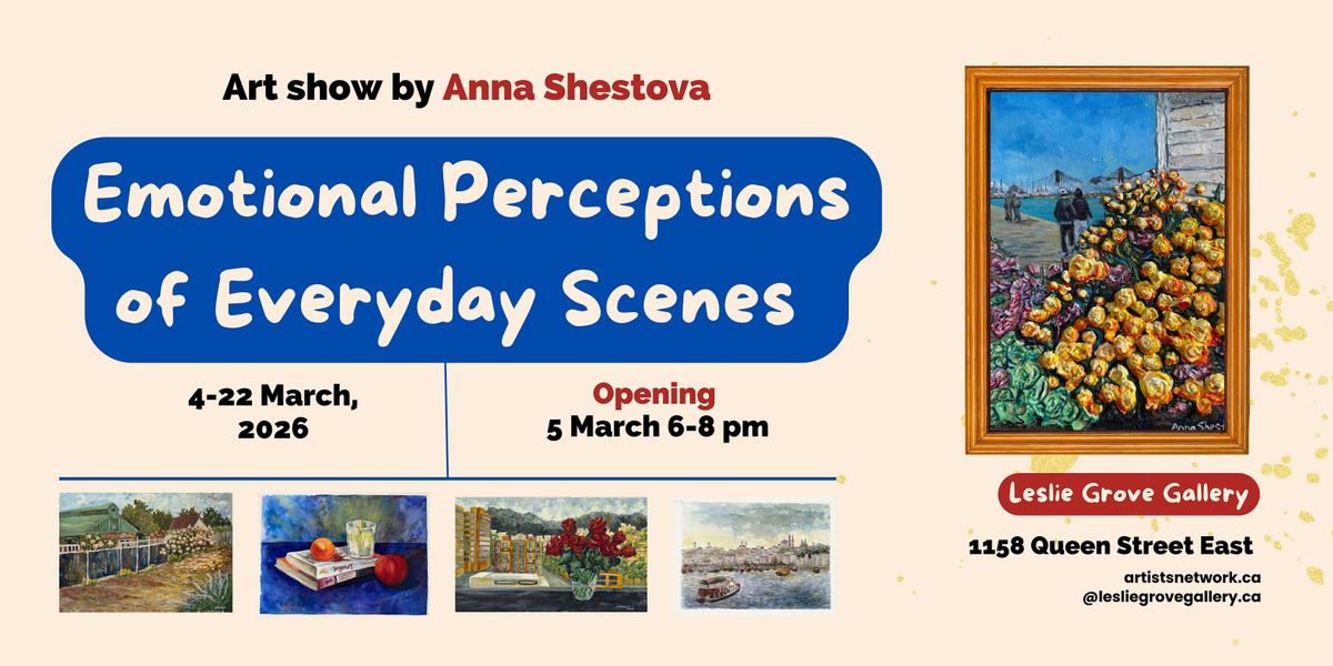 Anna Shestova’s solo exhibition Emotional Perceptions of Everyday Scenes brings together watercolour, oil, and mixed media works inspired by travel and quiet observation. Each piece reflects light, colour, and form as emotional memory. The Leslie Grove Gallery from March 4-March 22. Gallery hours: Wednesday to Sunday 12-5 PM. Opening reception will take place on Thursday, March 5, 6-8 pm.