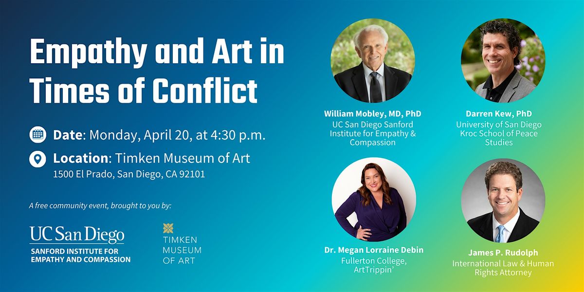 The Community Panel event aims to explore themes of empathy, art, and peace with those whose lived experience has presented challenges to employ them. This community panel is in partnership with the UC San Diego, Sanford Institute for Empathy and Compassion, and the Timken Museum in Balboa Park, San Diego, CA. The inaugural panel is scheduled for April 20, 2026, at 4:30 pm and will bring together voices from academia, art, culture, and community to explore how empathy and compassion are made real through creative expression, cultural memory, and collective experience. Our hope is that this dialogue will deepen understanding of how empathy and compassion can enable an understanding of the roots of conflict and guide practices to resolve them. Our confirmed panelists are Dr. Darren Kew, Dean of the University of San Diego Kroc School of Peace Studies; Dr. Megan Lorraine Debin, Professor of Art History and Founder of Art Trippinβ; and James Rudolph, Attorney in San Diego and Washington, D.C., LL.M. in international law and human rights. Moderators are Dr. William Mobley, Institute Director of the Sanford Institute for Empathy and Compassion and Megan Pogue, Executive Director of the Timken Museum.
