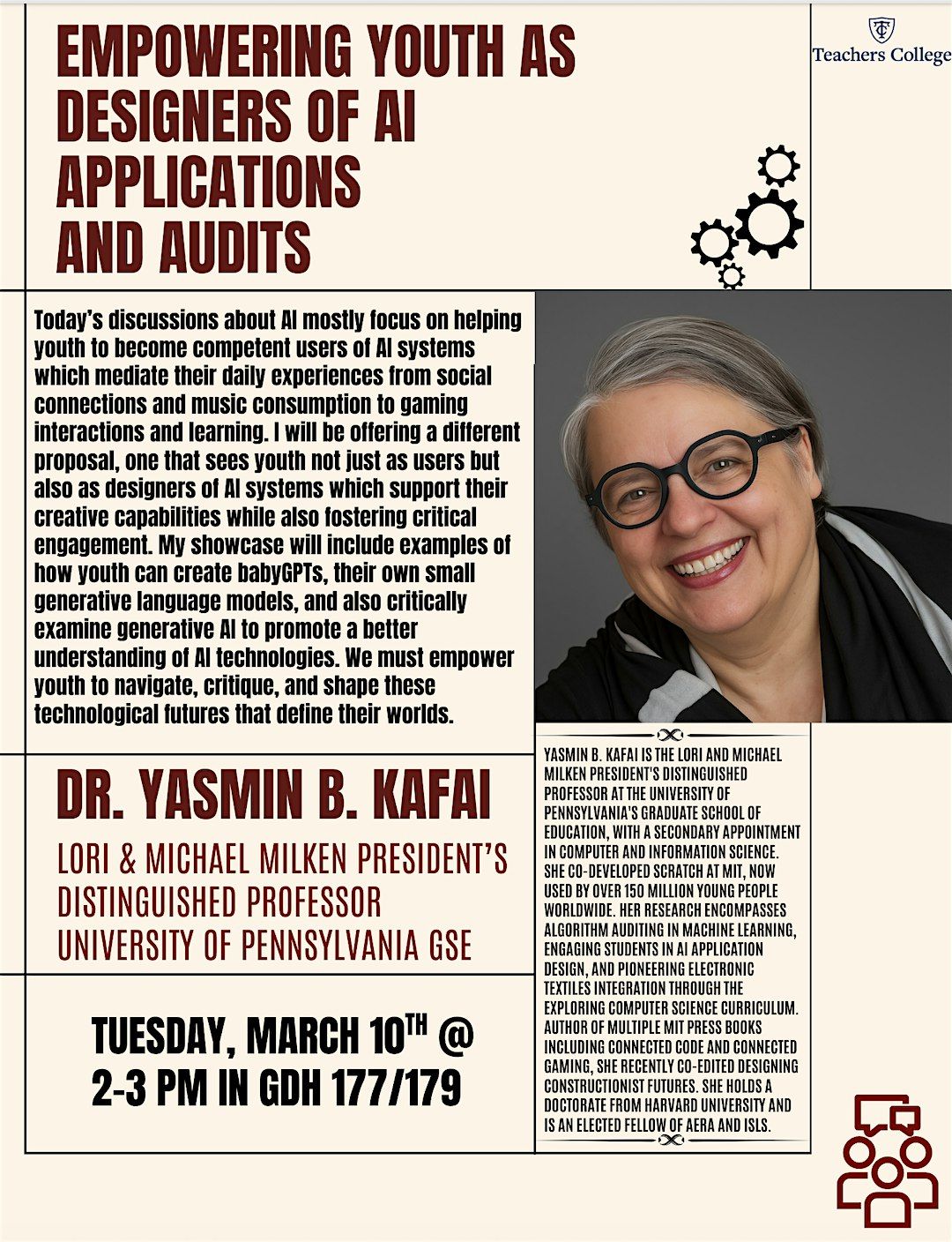 PROFESSOR AT THE UNIVERSITY OF PENNSYLVANIA'S GRADUATE SCHOOL OF EDUCATION, WITH A SECONDARY APPOINTMENT IN COMPUTER AND INFORMATION SCIENCE. SHE CO-DEVELOPED SCRATCH AT MIT, NOW USED BY OVER 150 MILLION YOUNG PEOPLE WORLDWIDE. HER RESEARCH ENCOMPASSES ALGORITHM AUDITING IN MACHINE LEARNING, ENGAGING STUDENTS IN AI APPLICATION DESIGN, AND PIONEERING ELECIRONIC TEXTILES INTEGRATION THROUGH THE EXPLORING COMPUTER SCIENCE CURRICULUM. AUTHOR OF MULTIPLE MIT PRESS BOOKS