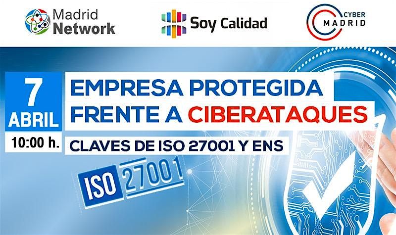Madrid Network organiza junto con Soy Calidad y CyberMadrid , la jornada informativa: Empresa protegida frente a Ciberataques, el martes 7 de abril a las 10:00 h, en la sede del Paseo de la Castellana, 91, 2ª planta, Madrid.