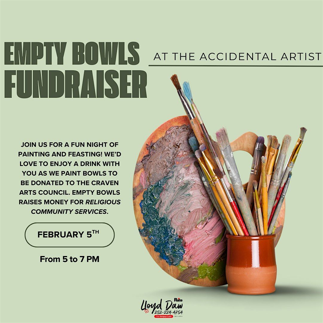 We'd love to have you join us at The Accidental Artist for our Empty Bowls fundraiser on February 5th from 5-7 PM. This will be a great time to mingle and create beautiful artwork for Empty Bowls - an organization that raises funds for Religious Community Services in the New Bern area. What a great way to serve our small community.