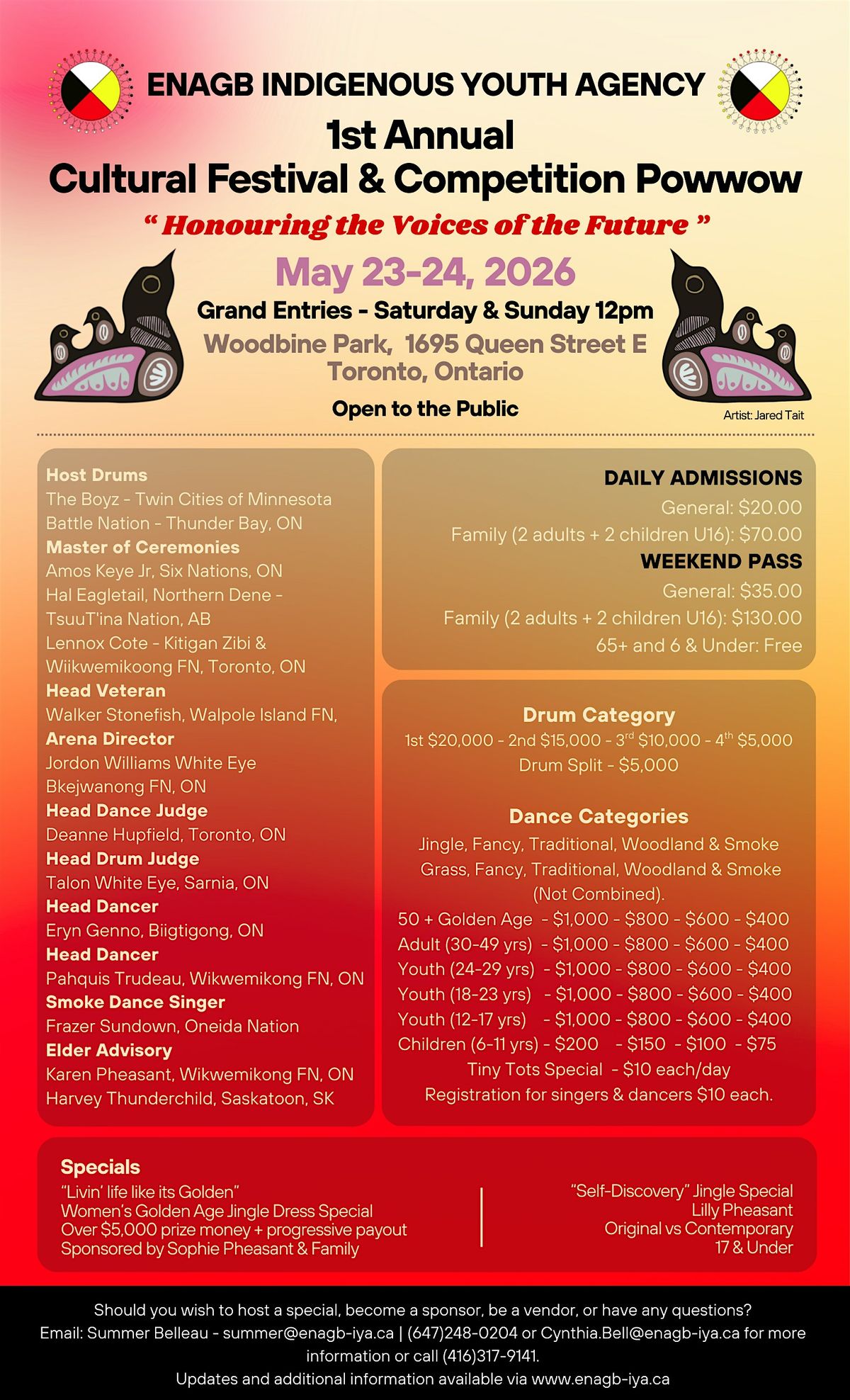 Welcome to the ENAGB Indigenous Youth Agency's 1st Annual Cultural Festival and Competition Powwow happening at Woodbine Park on May 23 and 24, 2026 from 12 pm to 8 pm each day! Join us for a day filled with vibrant performances, traditional dances, competition and delicious food. Don't miss out on this opportunity to celebrate Indigenous culture and heritage with the community. See you there!