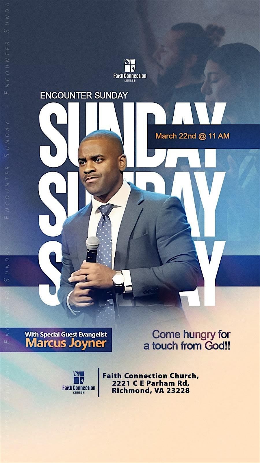 Are you hungry for the presence of God and be in an atmosphere of faith where the Lord is moving? Joing us THIS SUNDAY, March 22nd at 11 AM for a very special service with our guest Evangelist Marcus Joyner who will be preaching and praying for everyone!