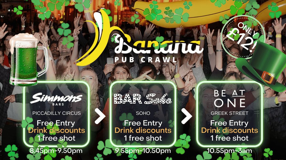 🍀 St Patrick’s Special Edition – Banana Pub Crawl 🍀This week, the Banana Pub Crawl goes full Irish for St Patrick’s Day! Expect a green-themed party, extra good vibes, some goodies, and the craziest pub crawl atmosphere in London. Grab your outfit, bring your friends, and get ready for a legendary night of bar hopping to celebrate St Patrick’s the right way – with drinks, music, and hundreds of party people.