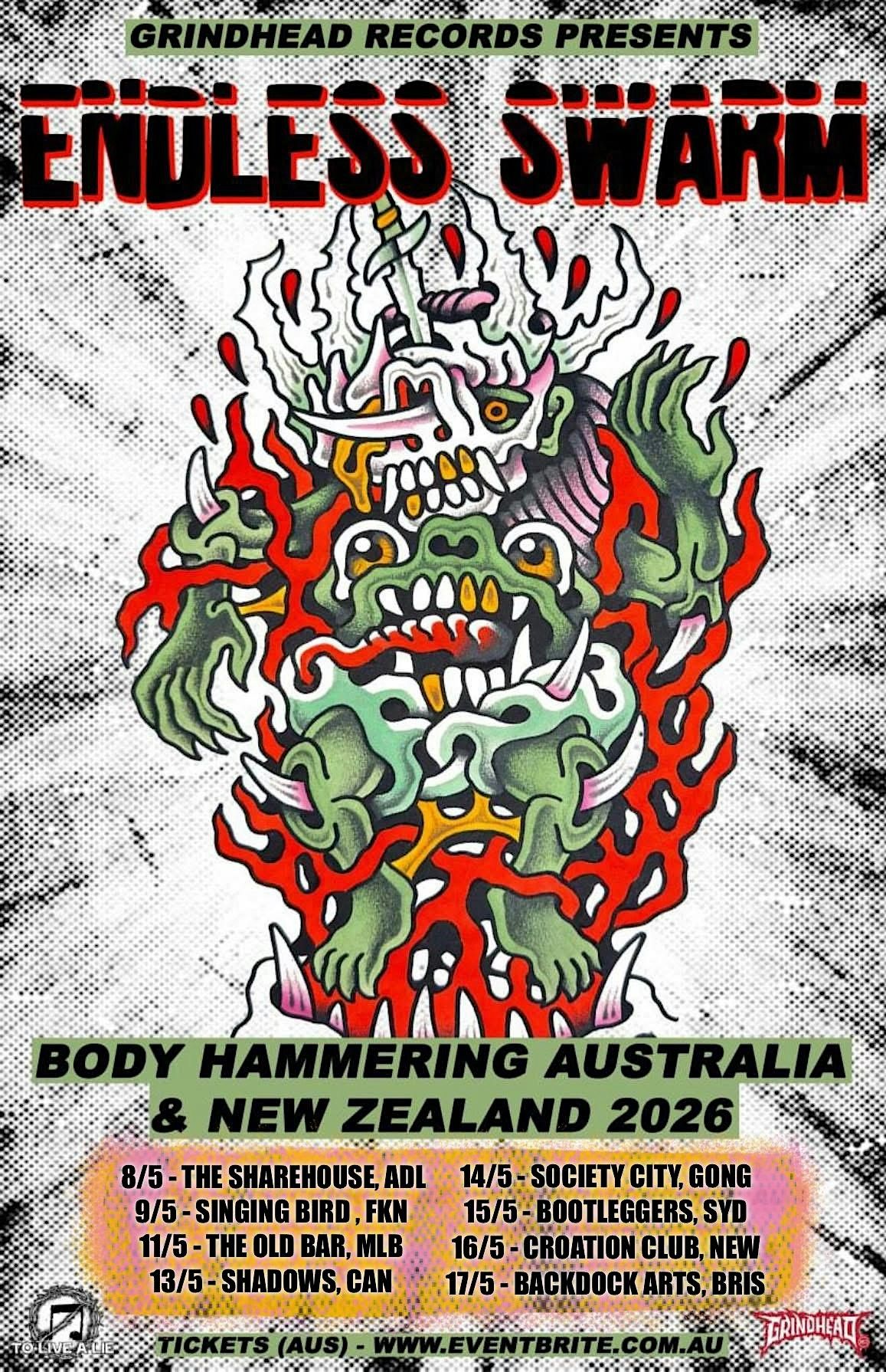 This May, the Body Hammer swings hard across New Zealand and Australia. Expect blistering tempos, sweat-soaked rooms and total sonic annihilation as Endless Swarm bring their chaos south for the very first time.