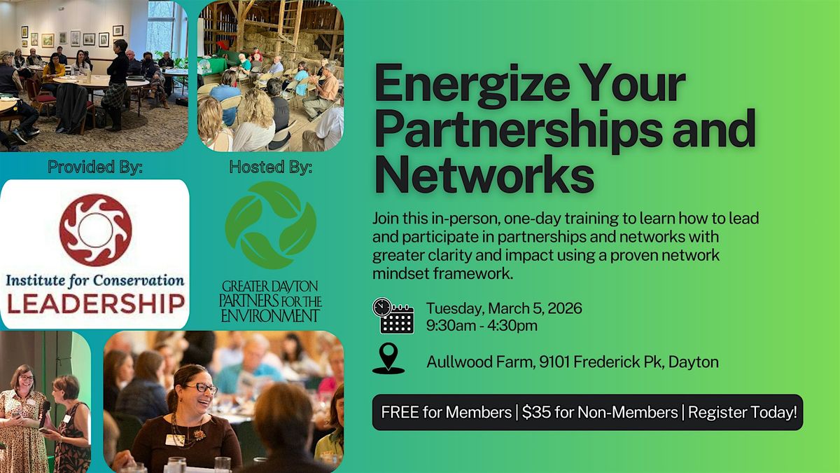 Collaborative work is essential to addressing environmental and community challenges—but it can be complex and time-consuming. This in-person, one-day training, provided by the Institute for Conservation Leadership and hosted by the Greater Dayton Partners for the Environment, focuses on how to lead and participate in collaborations more effectively by adopting a network mindset.
