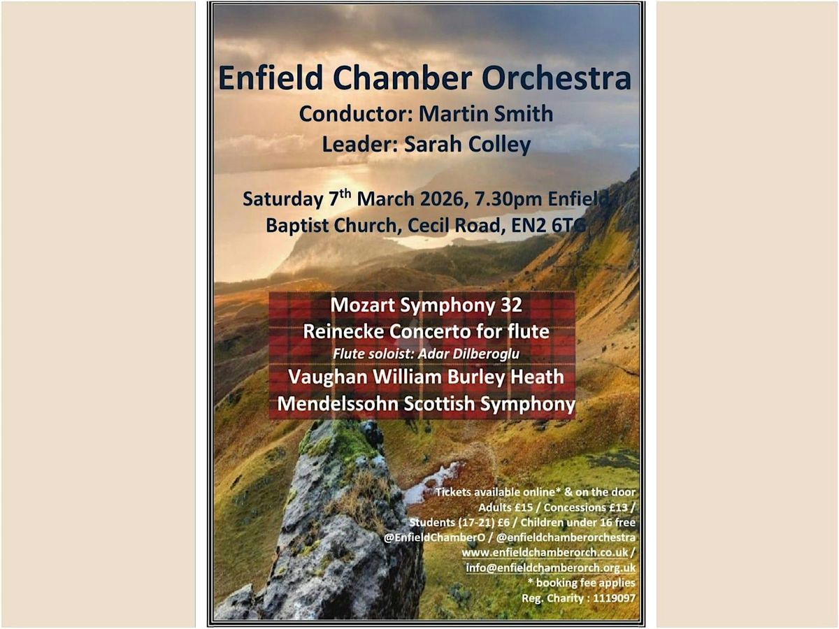 The concert begins with Mozart's Symphony no 32. A short work of around 8 minutes written in 1779 in 3 short movements. We will then perform Reinecke’s concerto for flute with soloist Adar Dilberoglu. Adar plays with the Enfield Youth Symphony Orchestra and has been selected to perform with EchO through our highly successful collaboration with Enfield Music Service.Vaughan William’s Burley Heath, is a subtle, beautiful work, inspired by the village of Burley in the New Forest. Our concert concludes with Mendelssohn’s well known Scottish Symphony in which the second movement in particular is very much in the style of Scottish Folk music both rhythmically and melodically.We very much look forward to seeing you on 7th March