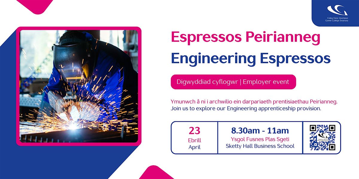 Dewch i Espressos Peirianneg Coleg Gŵyr Abertawe, digwyddiad hanfodol i gyflogwyr ar draws y sectorau peirianneg a modurol sydd am aros ar flaen y gad o ran sgiliau, hyfforddiant a datblygu talent.