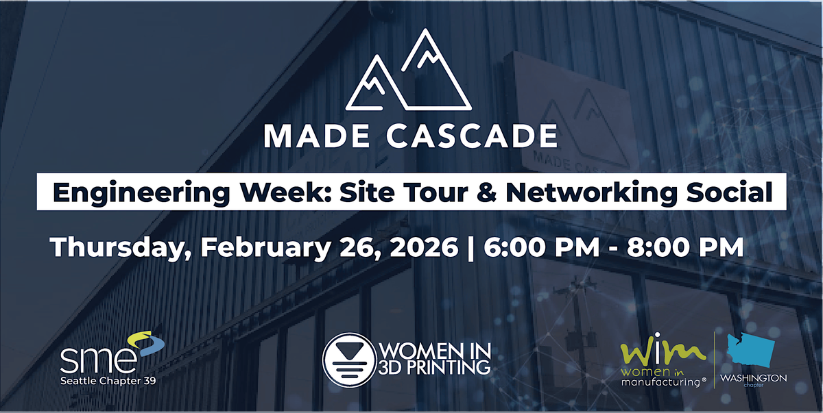 Join us Thursday, February 26, 2026 at 6:00 PM for an exclusive behind-the-scenes look at Made Cascade. Tour the Made Cascade facility and learn more about their equipment and manufacturing processes, listen to engaging tehnical talks, and mingle with manufacturing professionals from the WiM WA (Women in Manufacturing WA Chapter) & The Women in 3D Printing Seattle Chapter.