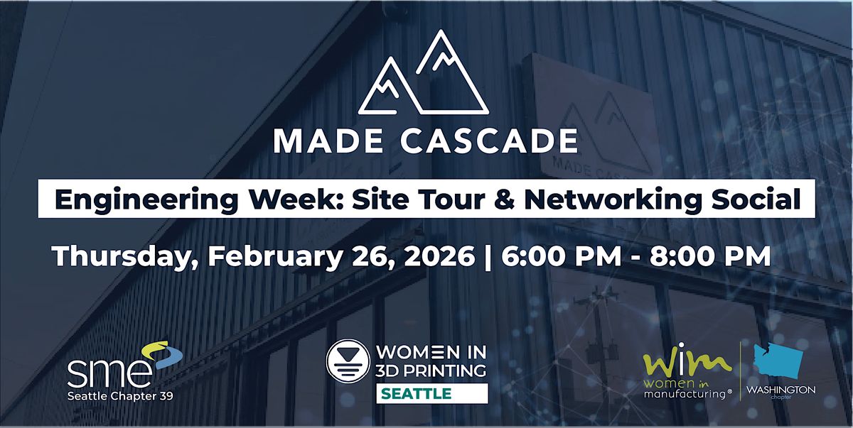 Join us Thursday, February 26, 2026 at 6:00 PM for an exclusive behind-the-scenes look at Made Cascade. Tour the Made Cascade facility and learn more about their equipment and manufacturing processes, listen to engaging tehnical talks, and mingle with manufacturing professionals from the WiM WA (Women in Manufacturing WA Chapter) & The Women in 3D Printing Seattle Chapter.