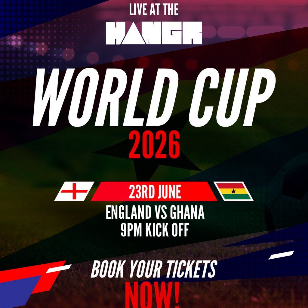 England vs Ghana in the 2026 World Cup! Watch it live on big screens at The Hangr with full atmosphere, drinks & food. Tuesday 23rd June, 9pm kick-off