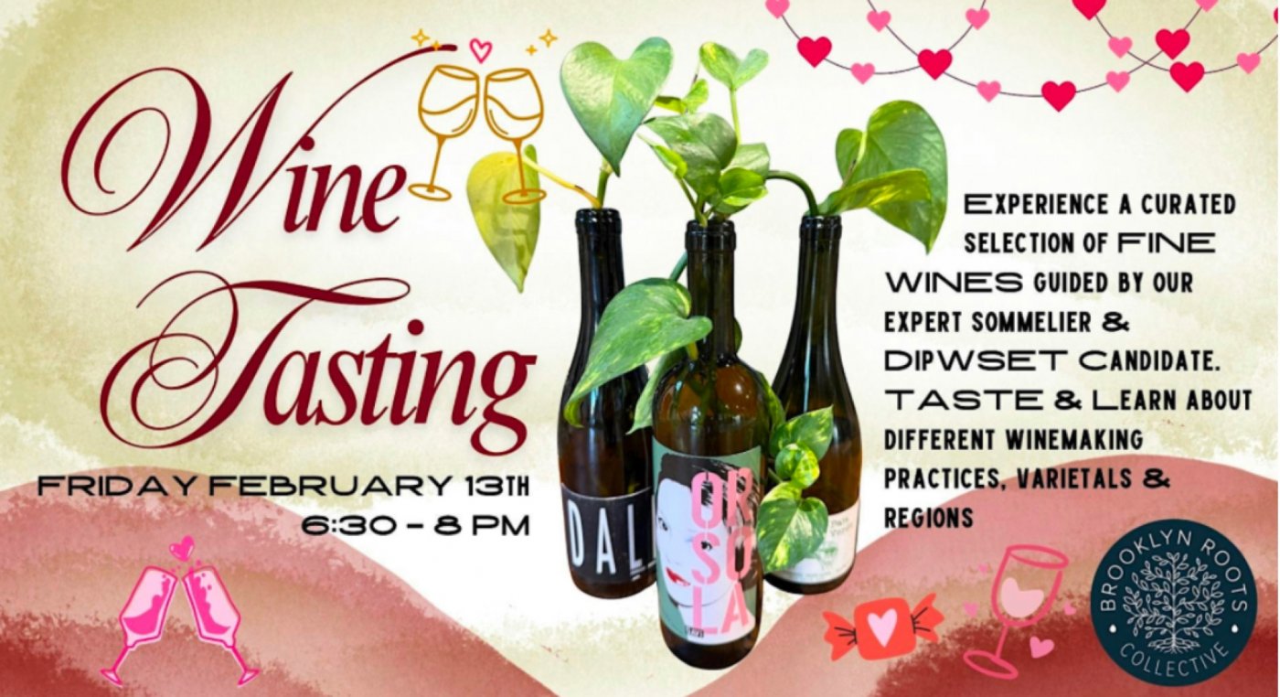 Sip, learn, and savor at Brooklyn Roots Collective (255 Randolph Street) during a Wine Tasting on Friday, February 13th. Wine expert Preeti will lead a festive and flavorful evening on the mezzanine from 6:30 PM to 8 PM, guiding guests through a curated tasting of fine vegan wines. Learn what makes these selections so exceptional, from their production and filtration processes to the stories behind each bottle. It’s an engaging, convivial experience designed for discovery, connection, and celebration at Brooklyn Roots Collective. Tickets purchased in advance qualify for their Early Bird pricing of $40, and General admission tickets begin at $50 and can be purchased by visiting http://bit.ly/4qzCt8S