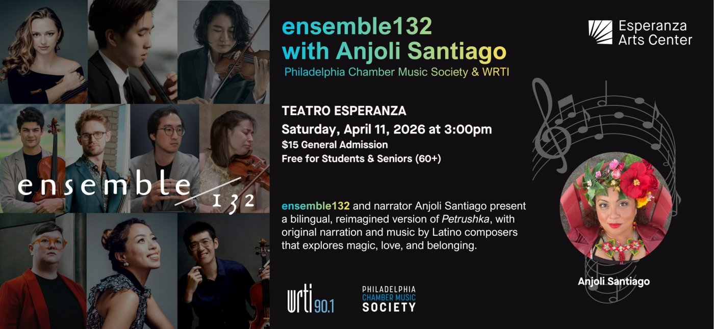 ensemble132 will be joined by Philadelphia storyteller Anjoli Santiago to perform a reimagined bilingual version of Igor Stravinsky’s Petrushka. Experience a classic tale woven with ancestral stories to explore magic, love, belonging, and purpose – featuring original narration, written and performed by Santiago to complement the score and a performance of chamber works by Latine composers.