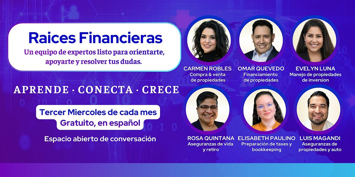 Seguros, Compra, venta y manejo de propiedades, Inversión en bienes raíces, Preparación de impuestos, Organización financiera personal y de negocio, entre otros. No es necesario que tengas preguntas preparadas. Este es un espacio abierto para aprender, compartir experiencias y apoyarnos mutuamente.