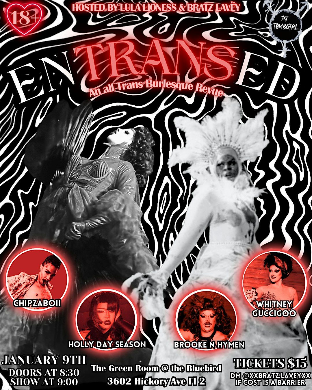 Welcome to Entransed: all trans burlesque revue happening at The Bluebird Cocktail Room on January 9, 2026 at 8:30 PM Get ready for a night filled with dazzling performances and empowering artistry. Join us for a celebration of trans beauty, talent, and creativity. Let's come together to support and uplift the trans community in a fun and inclusive space. Don't miss out on this unforgettable evening! Mark your calendars and spread the word. See you there!