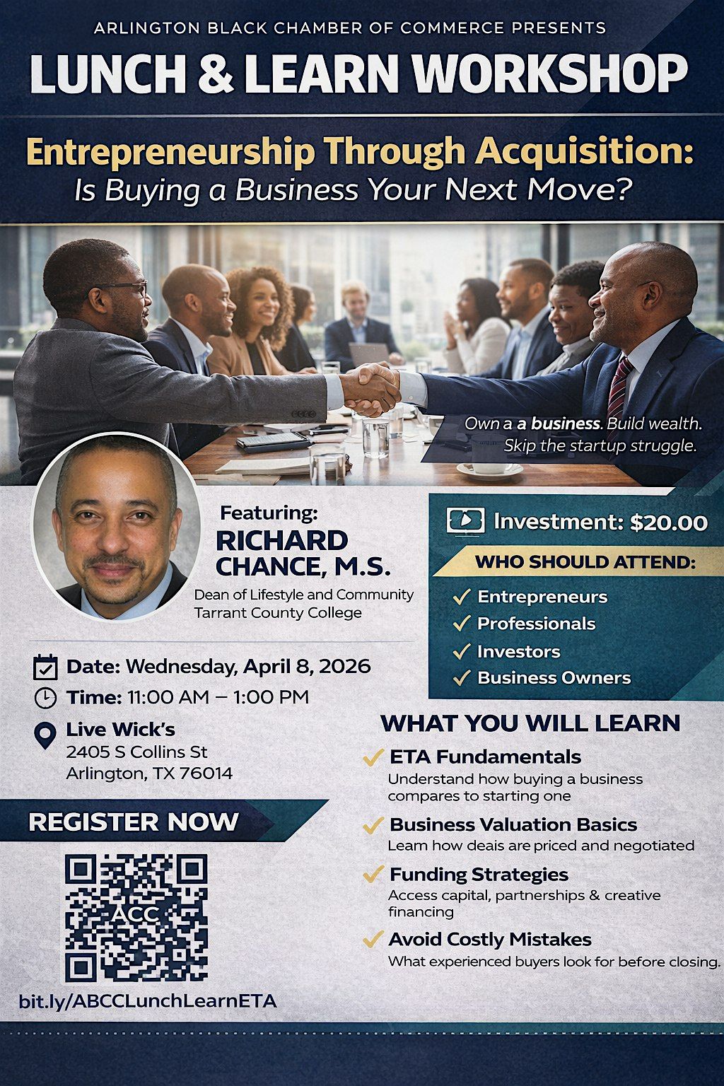 This high-impact Lunch & Learn introduces entrepreneurs, professionals, and aspiring owners to the powerful strategy of Entrepreneurship Through Acquisition (ETA)—a proven pathway to building wealth through buying existing businesses.