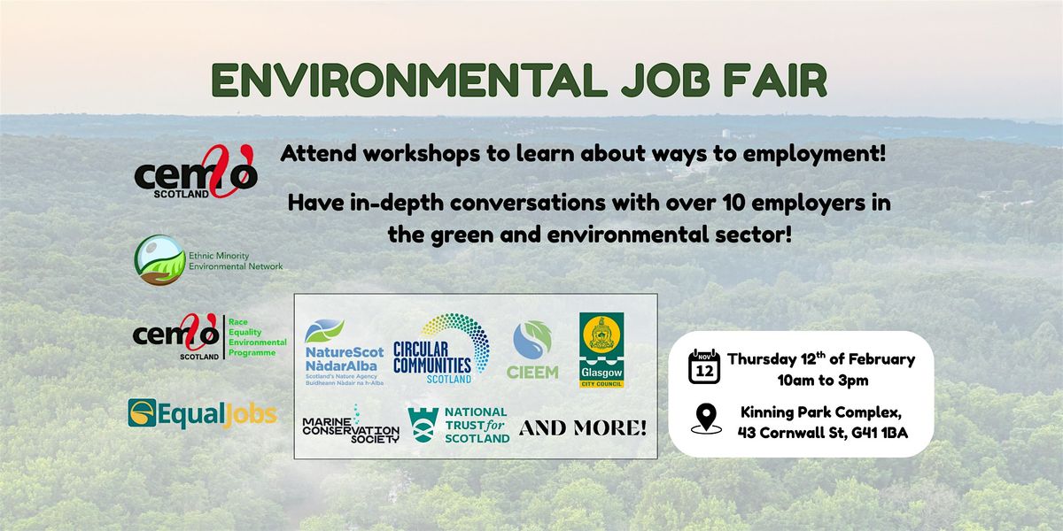 At CEMVO Scotland we recognise that race, ethnicity and socio-economic status intersect to create unique vulnerabilities and inequalities in the current situation of environmental crisis. This, of course, includes access to the job market, or even opportunities to be part of organisations addressing this crisis or helping us prepare for its future development. Our Environmental Job fair is part of our effort to help ethnic minority communities play an important role in the environmental sector, making a contribution to a fair, diverse and equal response to environmental challenges.