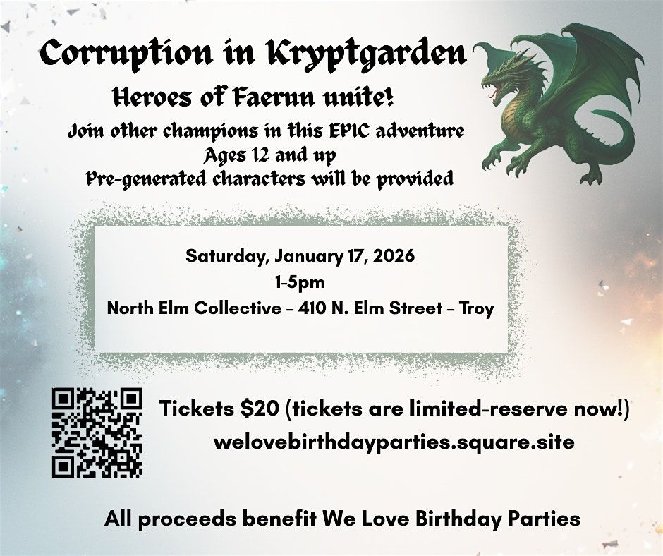 Tickets are $20 per person, with limited spots available for players ages 12 and up. This special “EPIC” D&D game offers a one-of-a-kind collaborative experience and supports a meaningful cause. Tickets can be purchased at welovebirthdayparties.square.site.