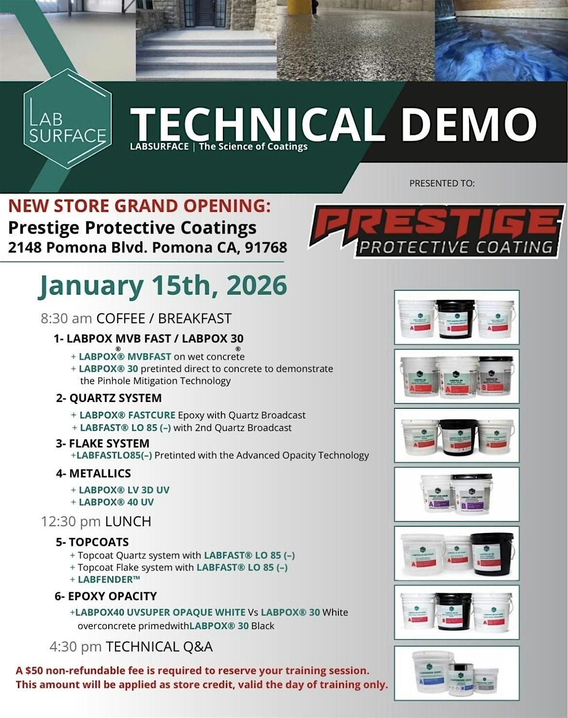 Join us for an exciting 1day epoxy class in California this June! Learn the latest techniques and trends in epoxy application at Prestige Protective Coatings. Our experienced instructors from Lab Surfaces will guide you through the process, whether you're a beginner or looking to refine your skills. Don't miss this opportunity to network with fellow enthusiasts and take your projects to the next level. Mark your calendars and get ready for a fun and educational experience!