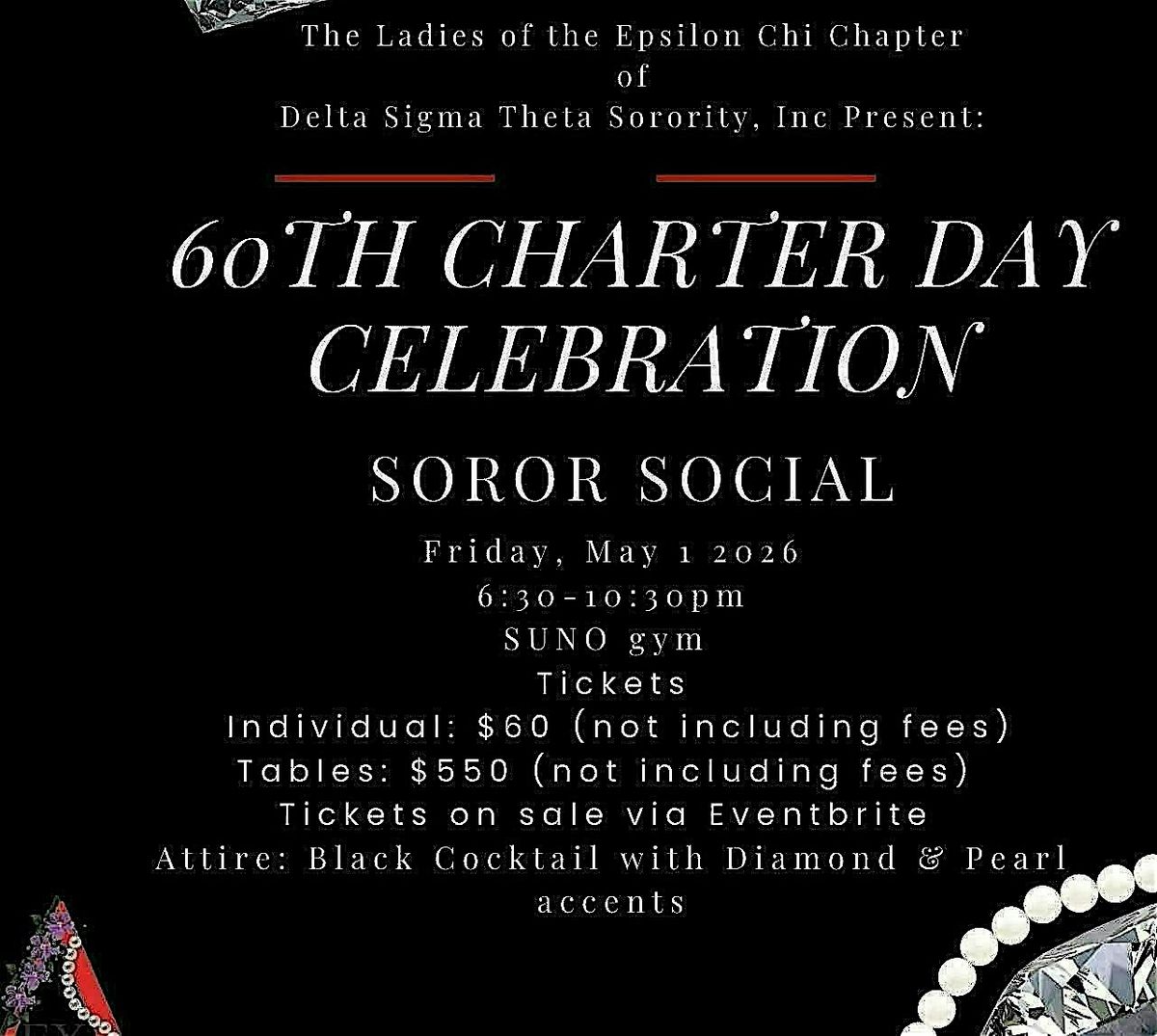 Join the Epsilon Chi Chapter of Delta Sigma Theta as we mark an incredible milestone—our 60th Charter Day Celebration! This special in-person event is all about honoring the legacy, friendship, and sisterhood that make our chapter so unique. Come enjoy good vibes, great company, and memorable moments. Don't miss out on this awesome celebration!
