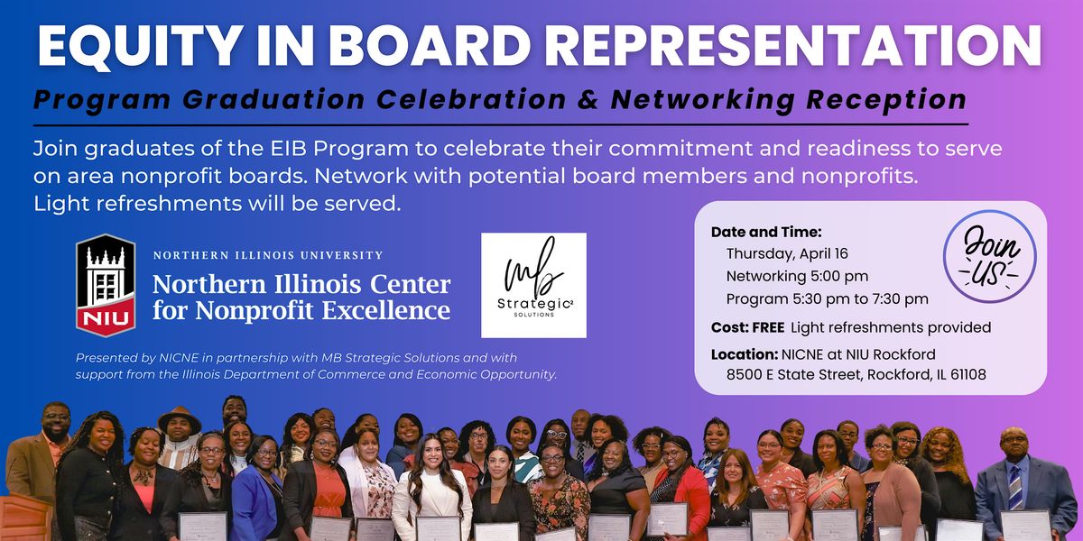 - 2026 Equity in Board Representation Program presented in partnership with NICNE and Martesha Brown, MBA of MB Strategic Solutions, held in February and March 2026, which empowered 40 individuals with board leadership skills, matching them to nonprofit board appointments for causes which they were passionate about, and celebrating their accomplishments while connecting them to area nonprofit organizations. Presented with support from the Illinois Department of Commerce and Economic Opportunity (DCEO) with funding secured by State Representative Maurice West.