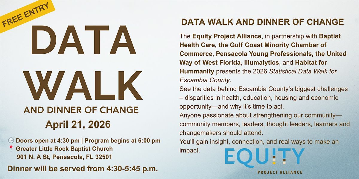The Equity Project Alliance, in partnership with Baptist Health Care, the Gulf Coast Minority Chamber of Commerce, Pensacola Young Professionals, the United Way of West Florida, Illumalytics and Habitat for Humanity, presents the 2026 Statistical Data Walk for Escambia County.