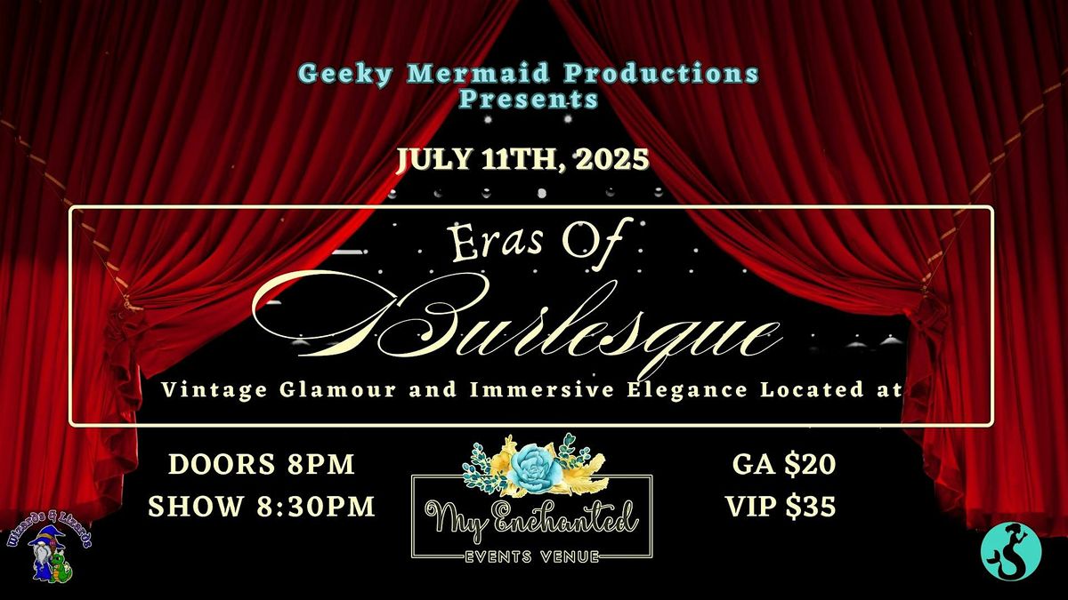 Lovers of the elegant, vintage and modern come together for this time capsule of Burlesque! Watch as we travel from the 20’s to 2020’s, hitting the glamour and seduction of each decade. Geeky Mermaid Productions is bringing this event to life as the 10th show brought to My Enchanted Events Venue. Its a timeline of tease and you’re all invited!