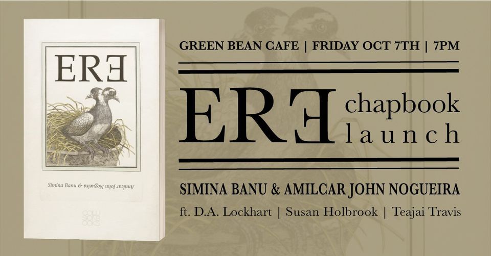Come spend a comfortable evening at the Green Bean Cafe for the launch of Amilcar John Nogueira and Simina Banu's new chapbook, Ere, published by @CollusionBooks.