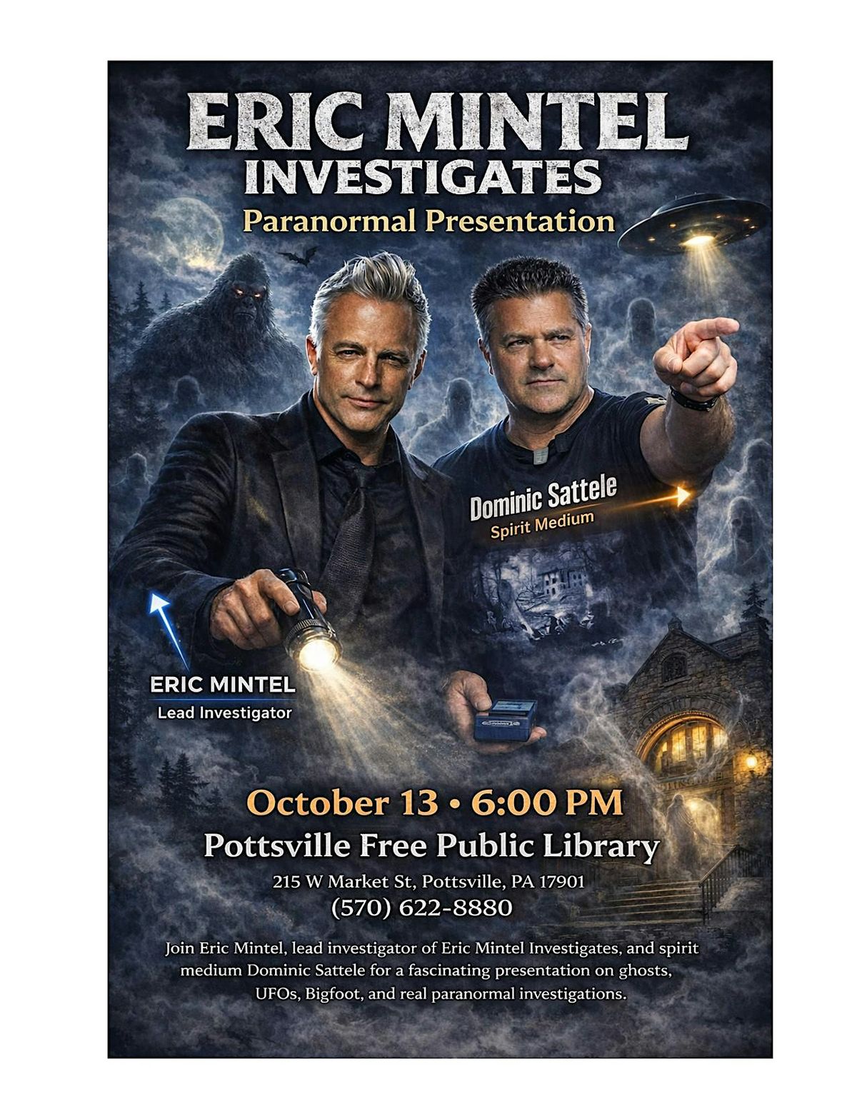 Join Eric Mintel, lead investigator of Eric Mintel Investigates, and spirit medium Dominic Sattele for a fascinating presentation on ghosts, UFO's, Bigfoot, and real paranormal investigations.