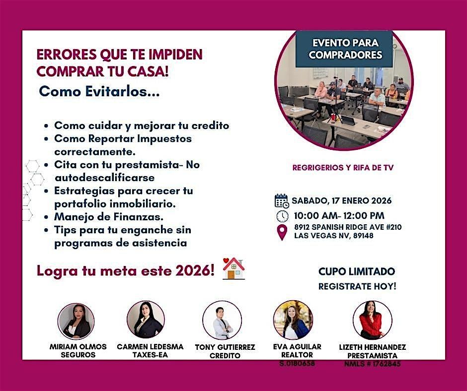 Te invitamos a un evento exclusivo donde descubrirás estrategias clave de la mano de expertos en Financiamiento Hipotecario, Reparacion de Credito Bienes RaÃces, Preparacion de Impuestos y Seguros.