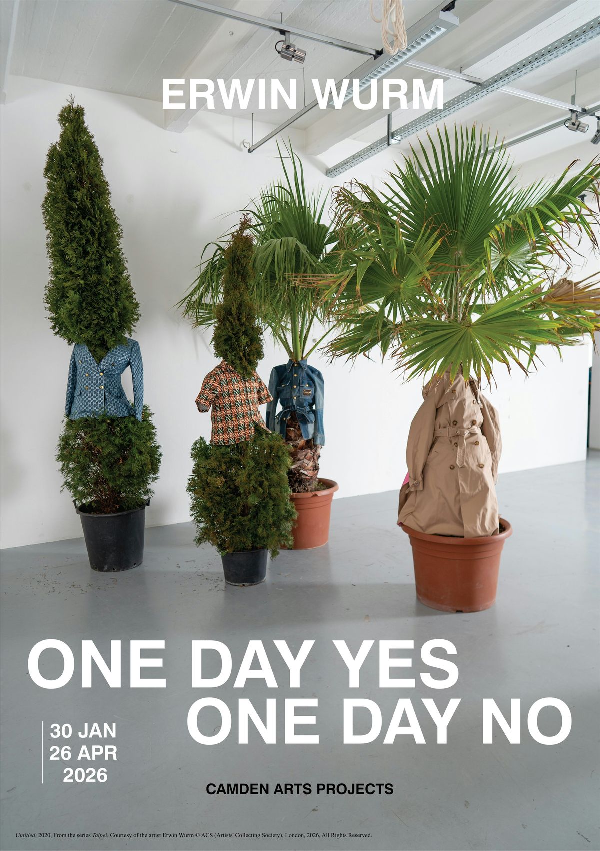 An immersive and playful exhibition which sees the world by the renowned celebrated artist Erwin Wurm, One Day Yes / One Day No stage plants as figures of everyday. A celebration of the anthropomorphic joy of childlike gaze, Wurm invited the local community to bring old clothes in which to dress large scale plants throughout the gallery.
