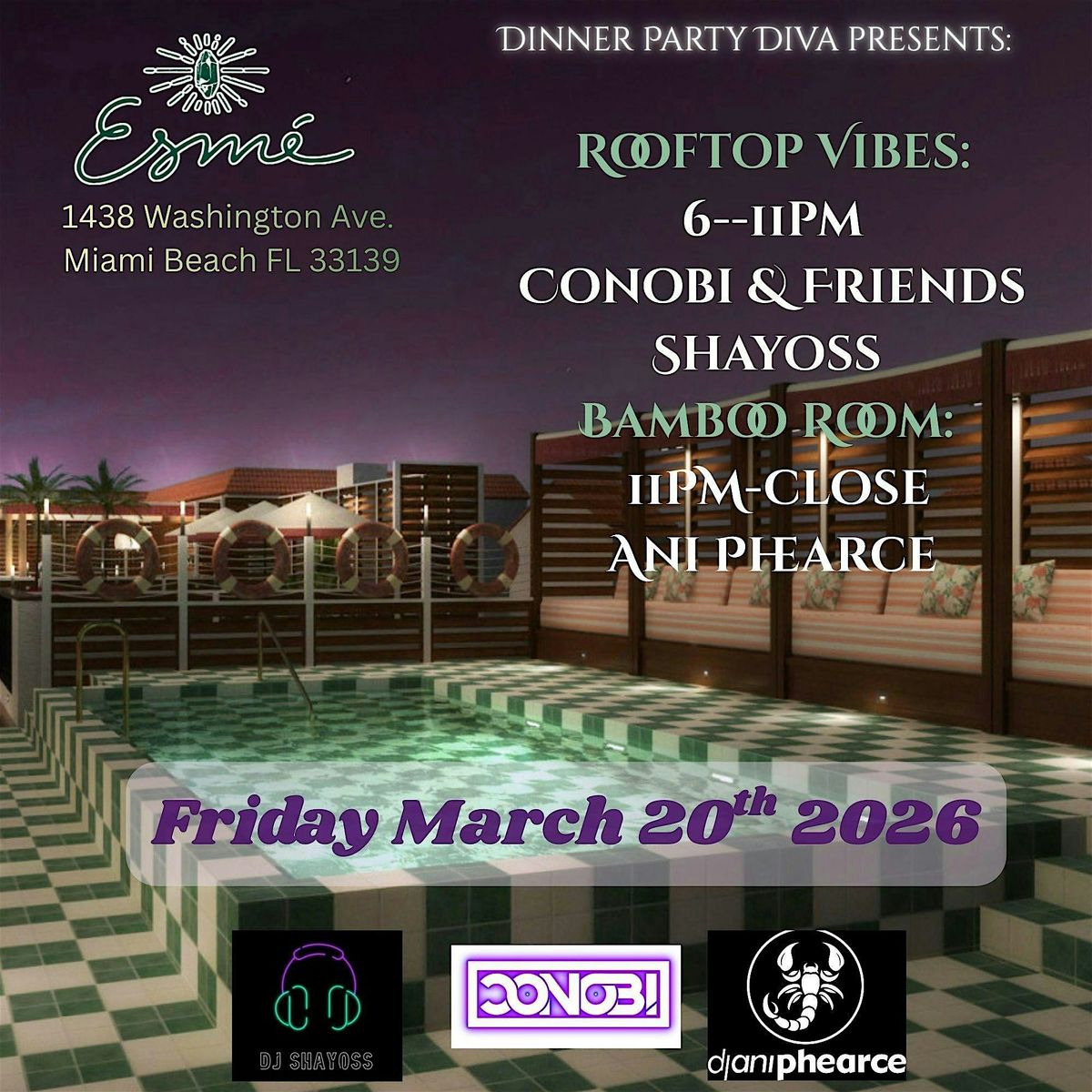 We kick things off on the rooftop at 630PM, setting the tone as the sun goes down, then keep the energy flowing inside the Bamboo Lounge for a full night of infectious house music.