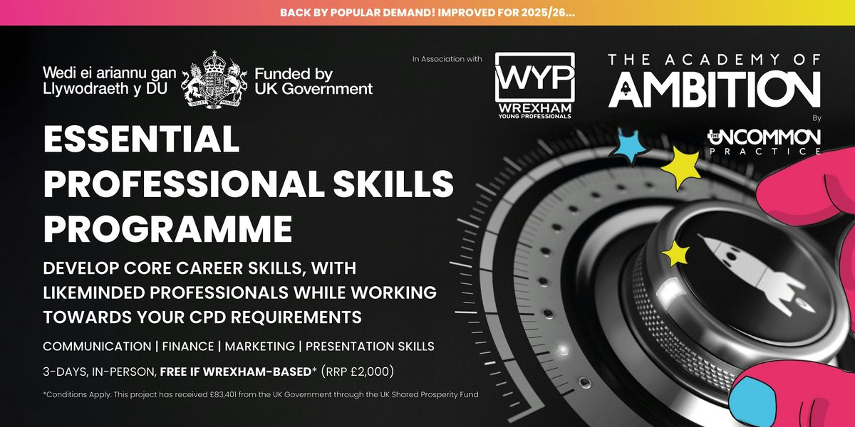In conjunction with Wrexham Young Professionals (WYP), and back by popular demand, The Academy of Ambition by The Uncommon Practice is delighted to run this unique WYP version of our "Essential Professional Skills" training programme over three days on Thursday 23rd October, Wednesday 12th November, and Wednesday 10th December 2025.