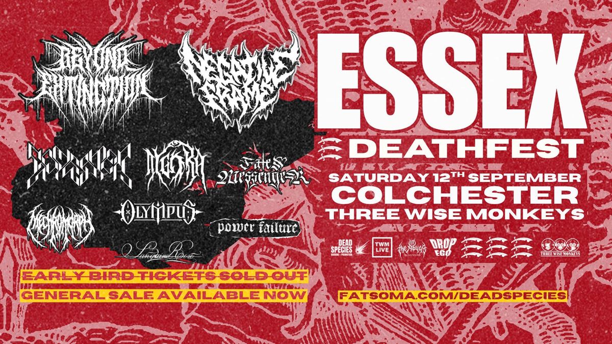 SATURDAY 12TH SEPTEMBER 2026 - THE INAUGURAL ESSEX DEATHFEST TAKES PLACE IN COLCHESTER. ONE FULL DAY OF THE HARDEST IN DEATH, HARDCORE AND CROSSOVER FROM ESSEX AND ACROSS THE UK.THREE WISE MONKEYS COLCHESTERΒ 12.9.2026