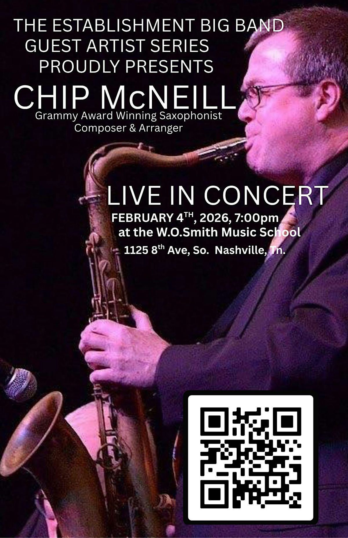 Chip McNeill, grammy award winning jazz saxophonist, composer, arranger and educator. Music Director for Maynard Ferguson & Arturo Sandoval, toured with Woody Herman and countless others. Alumni of the North Texas State University One O'Clock Lab Band, University of Miami Concert Jazz Band, and head of the Jazz Studies Program at Southern Illinois University in Champagne / Urbana. Come, bring your friends and enjoy the artistry of Chip with the Establishment Big Band.
