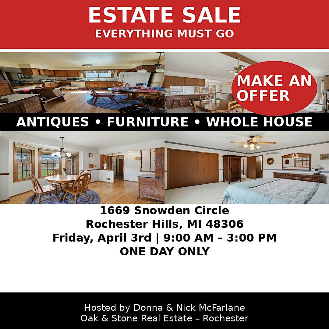 Step inside this packed, whole-house estate sale where you’ll find a wide variety of antiques, quality furniture, kitchen items, décor, and everyday household treasures—all priced to sell quickly. This is your chance to score unique pieces, vintage finds, and great deals throughout the entire home. Whether you're a collector, reseller, or just love a great bargain, you won’t want to miss this! Doors open at 9AM and it’s first come, first served—once it’s gone, it’s gone! 💥