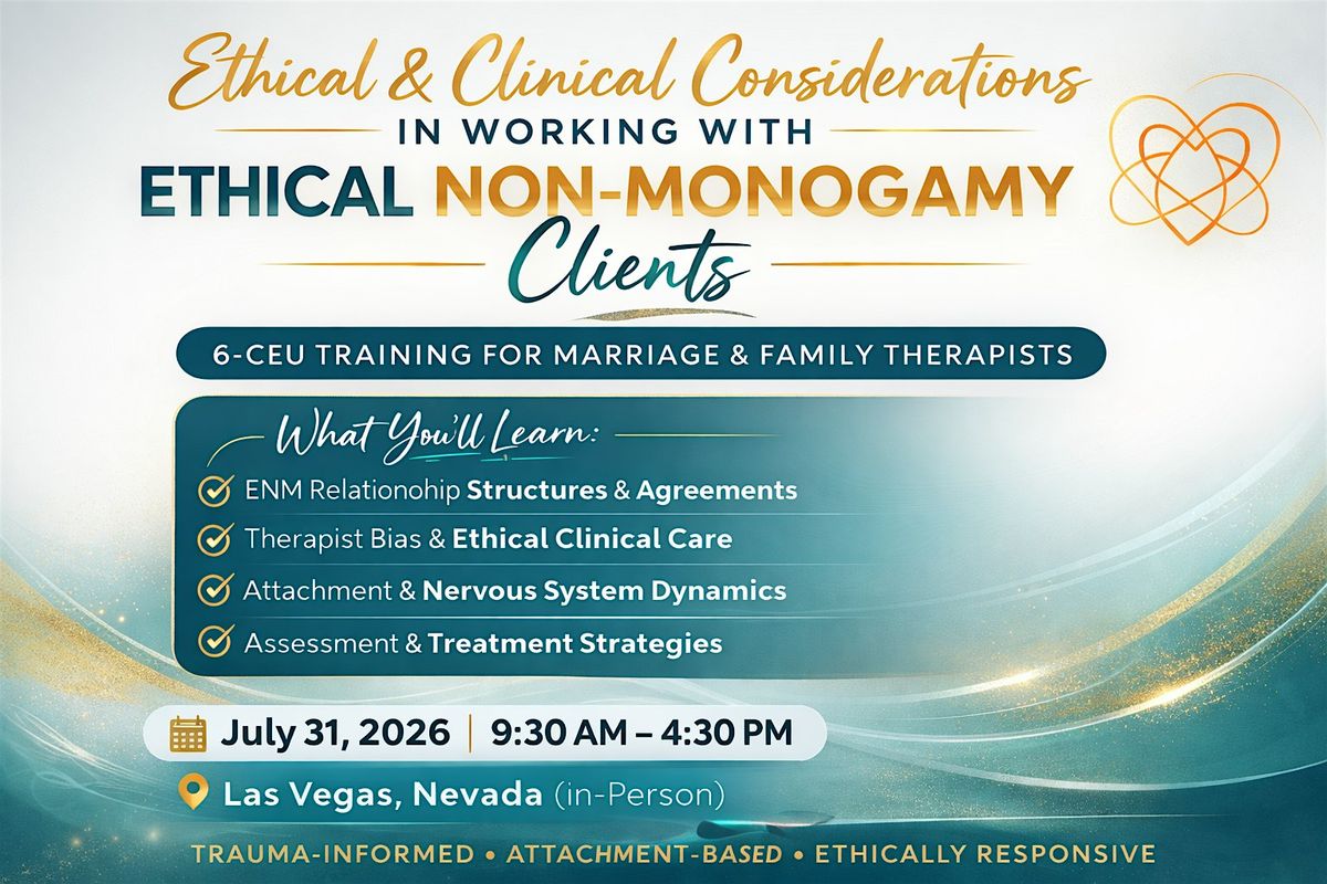 This in-person continuing education training is designed to enhance Marriage and Family Therapists’ clinical competence when working with individuals, couples, and relational systems practicing Ethical Non-Monogamy (ENM). As ENM becomes more visible in clinical settings, therapists increasingly encounter clients navigating complex relational agreements, attachment dynamics, and social stigma. However, many clinicians have received limited formal education on ENM-affirming and ethically responsible care.