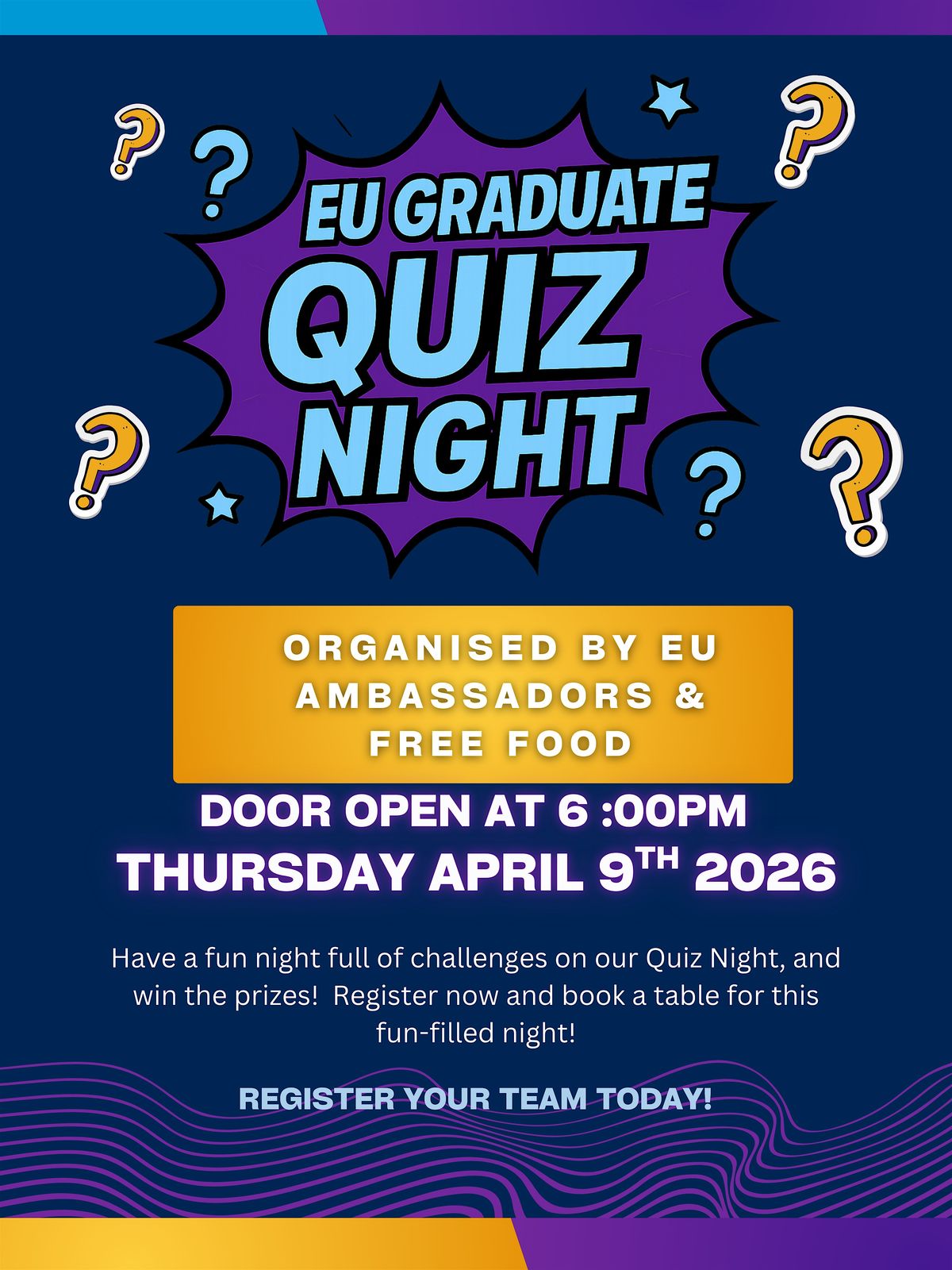 Join us for the EU Graduate Quizz a fun challenge to test your knowledge and meet fellow grads and enjoy complimentary food!About this Event