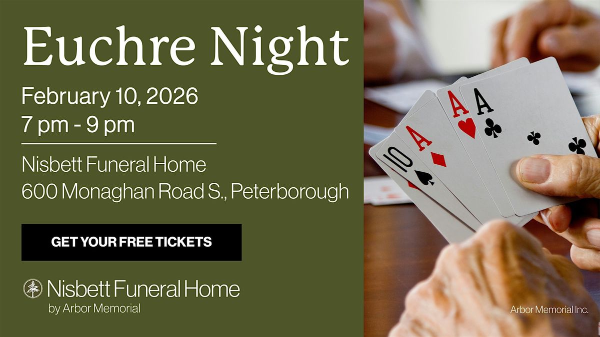 Join us for a FREE Euchre Night at Nisbett Funeral Home! Enjoy an evening of cards, laughter, and friendly competition. Meet new people, connect with your community, and savor light refreshments. Whether you’re a seasoned player or new to the game, everyone is welcome!