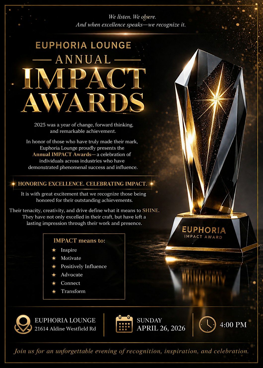 Join us in person for an unforgettable night celebrating amazing achievements and inspiring stories. The EUPHORIA IMPACT AWARDS is all about recognizing those who make a real difference. Expect great vibes, inspiring moments, and a chance to connect with passionate people. Don’t miss out on this epic event that’s sure to leave you buzzing with excitement!