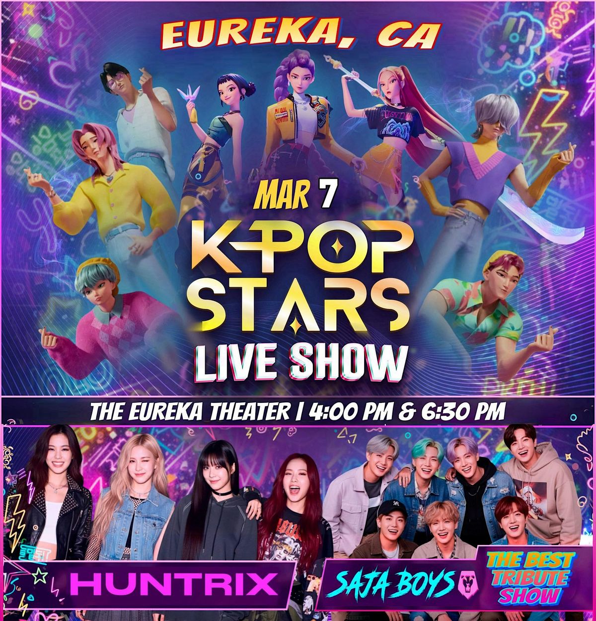 K-POP STARS LIVE SHOW is here to light up the stage with spectacular tributes to your favorite groups: Huntrix Saja Boys BLACKPINK BTS Feel the thrill of electrifying choreographies, stunning outfits, and all the energy that makes K-Pop shine — live on stage! Sing, dance, and vibe to the hits you love as if you were at a real concert in Korea!