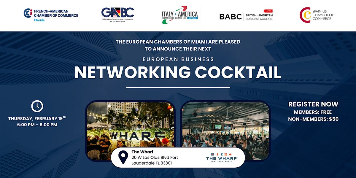 The first European Business Networking Cocktail of 2026 will be held on Thursday, Feb, 19th from 6:00 p.m. to 8:00 p.m. at The Wharf Fort Lauderdale, 20 W Las Olas Blvd, Fort Lauderdale, FL 33301.