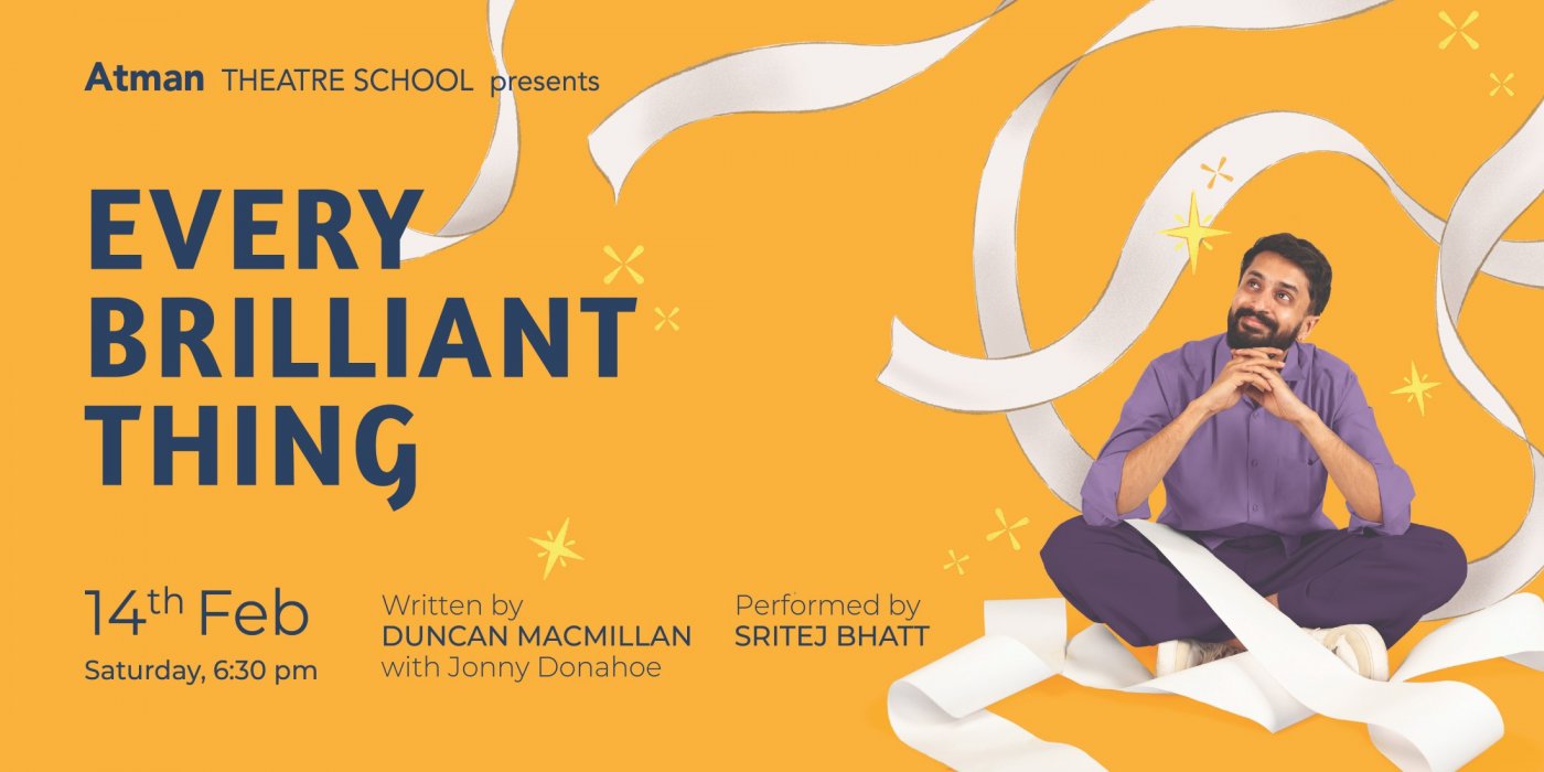 From Olivier Award-nominated writer Duncan Macmillan (People, Places and Things), Every Brilliant Thing comes to Kanoria Centre for Arts (Urmila Kailash Black Box) performed by Sritej Bhatt, produced by Atman Theatre School. This unique and critically acclaimed play has become a global stage phenomenon, playing in over 80 countries worldwide.